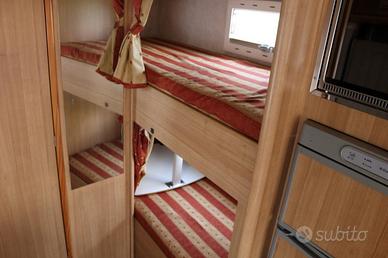 Piantina con bagno e doccia separati in coda, letti singoli a castello longitudinali e letto matrimoniale in mansarda. Sono inoltre disponibili un letto singolo e uno matrimoniale che è possibile ricavare dalla doppia dinette.
