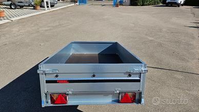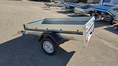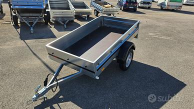 Rimorchio Elebi con misure interne 200x116 cm conmassa massima 750 kg a pieno carico, adatto al trasporto di merci , ruote da 13" , timone a V per guidare in sicurezza e pianale basso per favorire il carico.