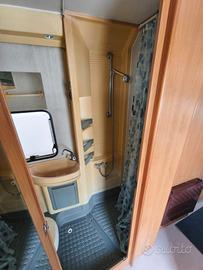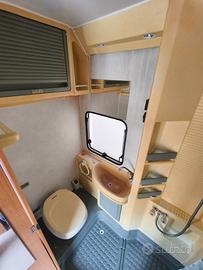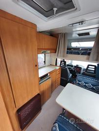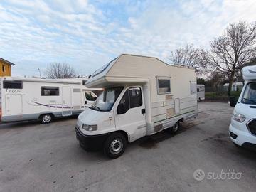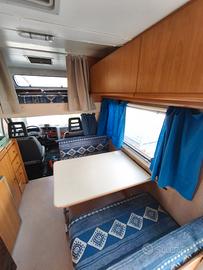 Autocaravan mansardato Riviera con spaziosa dinette anteriore, ampio letto matrimoniale sopra cabina e bagno con doccia separata, immatricolato 07/1996.