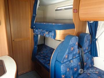 E' lungo solo614 centimetri,ha 6 posti letto distribuiti 2nel matrimoniale in mansarda, due nei letti a castello posteriori lato guida e due ricavabili nella semplice trasformazione della dinette.