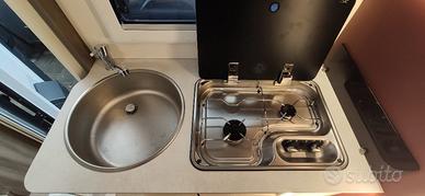 Semintegrale di casa Roller Team con letto matrimoniale trasversale in coda su motore Ford Transit 2.0 165 CV. 4 posti omologati e 3 posti letto. Lungo 5,99 e largo 2,15. Il veicolo è già accessoriato di: cerchi in acciaio da 16'', Cruise Control, TPMS, attacchi isofix, fari fendinebbia, freno a mano elettrico, retrocamera, sensori di parcheggio anteriori, clima cabina automatico, ABS-ESP, doppio airbag, radio touchscreen 12'' Apple Car Play e Android Auto, quadro strumenti semi-digitale 8'', specchietti elettrici con sbrinatore, Fix&Go, Start&Stop, finestre Seitz, prese USB zona notte, presa 220V nel garage e zanzariera scorrevole porta ingresso. Per renderlo ancora più bello abbiamo aggiunto il Pack Horon Fit (fari High Series con luci di svolta statiche, vano porta oggetti con serratura, rivestimenti interni e plancia strumenti Trend, paraurti e modanature laterali in tinta con la carrozzeria, porta ingresso XL a 2 punti di chiusura con finestra fissa e chiusura centralizzata, pannello solare 200W con regolatore MPPT, pannello CpPlus, copri lavello, coprisedili cabina, oscuranti plissettati cabina), il Pack Open Air ( veranda antracite, presa esterna gas, doccetta del gavone) e modificato il riscaldamento in Truma Combi 4 diesel.