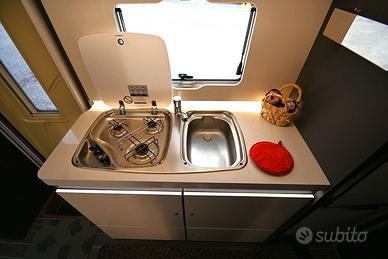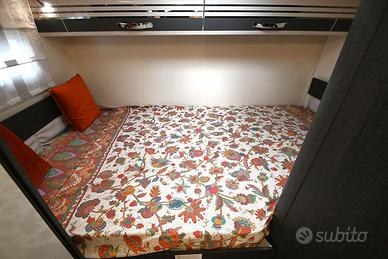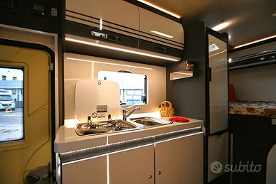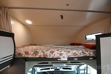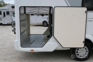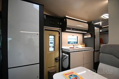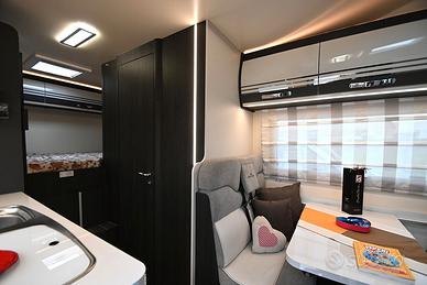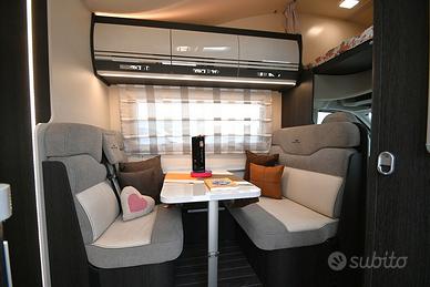ROLLER TEAM KRONOS 295 M: mansardato perfetto per la famiglia, con 6 posti letto e 6 posti omologati viaggio, maxi garage in coda comunicante con l'abitacolo e generose possibilità di stiavvio!