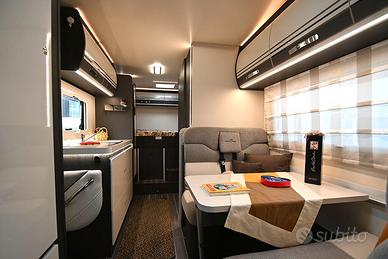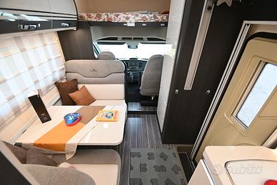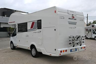 ROLLER TEAM KRONOS 295 M: mansardato perfetto per la famiglia, con 6 posti letto e 6 posti omologati viaggio, maxi garage in coda comunicante con l'abitacolo e generose possibilità di stiavvio!