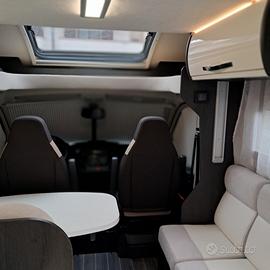 Semintegrale con letto matrimoniale nel basculante, semidinette affiancata da divanetto laterale nella zona anteriore, cucina ad L e bagno con doccia separata nella zona centrale e grande letto con sottostante gavone garage regolabile in altezza nella zona posteriore.