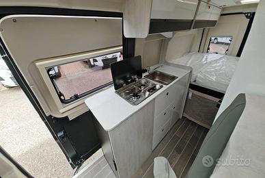 Van con letto matrimoniale posteriore, bagno con doccia, cucina con frigo a compressore 84l, semidinette con sedili anteriori girevoli.