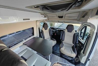 Van con letto matrimoniale posteriore e letto nel tetto a soffietto, bagno con doccia, cucina con frigo a compressore 90l, semidinette con sedili anteriori girevoli.