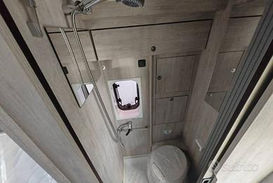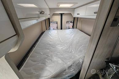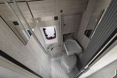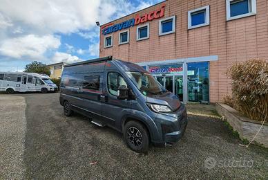 Van con letto matrimoniale posteriore basculante elettrico, bagno con doccia e cucina con frigo a compressore da 70l nella zona centrale, semidinette con sedili anteriori girevoli.