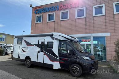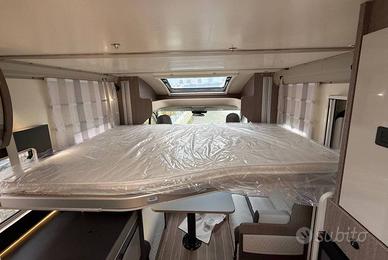 Semintegrale con letti singoli gemelli posteriori e gavone garage sottostante, bagno con doccia separata, cucina con frigo a compressore 158l, dinette face to face e sedili anteriori girevoli, letto basculante matrimoniale
