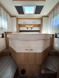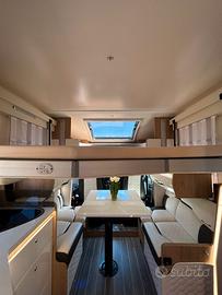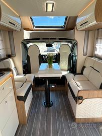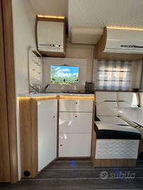 Batteria di avviamento nuova (Luglio 2025);Serrature esterne Safe door guardian Pack ,maxydisplay da 10" con Mirroring;Retrocamera a colori (sullo specchietto) e sensori di parcheggio?WC con maceratore elettrico e chiusura valvole ;Apertura con valvola elettrica per lo scarico delle acque grigie;Serbatoio recupero riscaldato;Nr. 2 Pannelli Solare Black Solar 350 W;Batteria supplementare al litio per corrente diretta 220V ;Inverter NDS 2000 W onda pura;Frigorifero maxi ;Trio Gas Allarme;Cassaforte;Kit serrature di sicurezza porte cabina, sia interne che esterne;Bagno con finestra;Poltrone cabina , con doppio porta braccio girevoli?Tappeto cabina Guida;Serbatoio gasolio maggiorato ;Serbatoio acque chiare supplementare ;Quinto Letto addizionale?Smart TV più staffa;Clima Truma Aventa;Oscuranti parabrezza e vetri cabina con zanzariera e plissé?Zanzariera maxi porta ingresso;Maxi Letto basculante regolabile elettricamente in altezza;Gavone Garage a volumetria carico variabile elettricamente;Luci luci ambiente LED;Prese 230 V e USB;Regolatore Gas Truma mono control CS;Filtro gas Truma;Piano cottura inox tre fuochi Piezo;Tavolo traslabile; Finestre posteriori in camera;Luci interne ed esterna LED;Vano bombole per due da 11 kg;Oscurante esterno antigelo parabrezza e cofano;Coppia cunei?Tappeto per veranda esterna Midland grigio;Tavolino per esterno ripiegabile con quattro sgabelli all'interno;Tendalino esterno Fiamma;Portabici posteriore;Telecamera wi-Fy;Set 4 gomme invernali;Copertura cofano e parabrezza invernale?