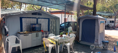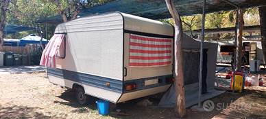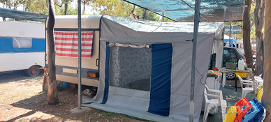 Vendo roulotte 4 posti un letto matrimoniale e un letto a castello.Veranda nuovissima comprata quest'anno, gazebo in ferro battuto 3 x 3, bagno funzionante con wc chimico portatile,tavolo da sei con sei sedie ,tavolino da 4, cucinino 1,50 x 1,50 pavimento modulare ad incastro per veranda, sedie varie per il mare, fornello da campeggio, 2 ventilatori da soffitto, kit di pichetti di fissaggio, tutto il pacchetto
