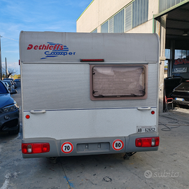 Vendo roulotte completa di veranda verandino stuoie a terra con boiler acqua calda, frigorifero, lavello interno esterno in acciaio inox componibile, fornello, bagno con doccia, riscaldamento canalizzato tenuta sempre al coperto illuminazione per veranda esterna, tubazioni per scarico per campeggio.