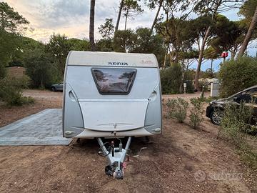 Roulotte Adria Aviva Move 495 CP Del 2010, revisionata 31 ottobre 2025, buone condizioni, 6 posti letto: letto matrimoniale anteriore con ampio gavone sottostante accessibile anche dall'esterno, dinette centrale trasformabile in letto da una piazza e mezzo, letto a castello posteriore, dotato di garage accessibile dall'esterno. Cucina con lavello e fornello a tre fuochi, cappa aspirante, forno a microonde, grande frigorifero; stufa a gas, boiler scaldaacqua, serbatoio acqua da 50 litri, armadio, bagnetto con lavandino con doccino estraibile e wc camperizzato. Accessoriata con mover.