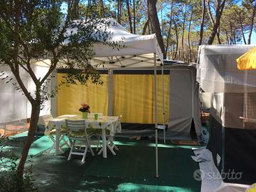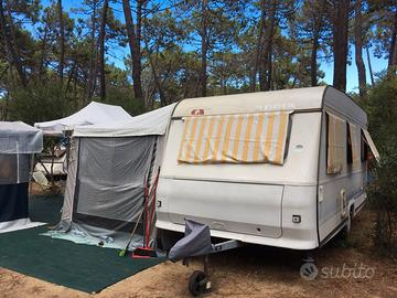 Roulotte Adria in ottime condizioni;lunga 6,279m larga 2,296m sbalzo post. 2,406m. Gavone anteriore. Gomme nuove. Illuminazione interna ed esterna. Frigo interno ed esterno. Completa di bagno. Letto matrimoniale con materasso ortopedico su misura e altri 2 letti. Tavolo interno ed esterno con 6 sedie. Cucina interna ed tenda cucinotto esterno. Veranda con lampadario. Finestre con zanzariere, oscuranti interni, tende interne, coprifinestre esterne. No perditempo. Si trova in rimessaggio a Castiglione della Pescaia (GR).