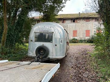 Roulotte marca Airstream modello safari anno 2/1964 mono asse lunga 6 metri da restaurare totalmente dentro e vuota e tutta in alluminio aeronautico rivettato si può trasforma in un truk food o abitativo i documenti vengono fatti una vota restaurata tramita motorizazione vendo x 25000 euro possibile vederla nel posto