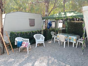 AAA...malincuore vendo "Claretta", Burstener Holiday del 91. Claretta è una 5/6 posti e più di 5 mt (senza timone, taglia 11 veranda Conver), ormai da parecchi anni dedicata al campeggio stanziale (potrebbe tornare su strada ma ha bisogno di una totale revisione della meccanica). Il bagno è camperizzato con recipiente esterno con ruote Fiamma, bagno usato poco perché sfruttato il bagno personale del camping. Gas e lavelli non usati da tempo perché abbiamo sfruttato quelli esterni in piazzola (da revisionare in caso di utilizzo). Tutta la cuscineria e il tendaggio sono stati fatti nuovi a giugno 2025. Usato solo il letto matrimoniale per 20 gg, le altre dinette mai utilizzate.