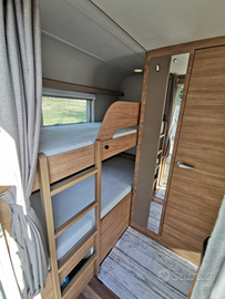 2 Letti a castello posteriori, dinette anteriore molto grande per un totale di 6 persone, trasformabile in ampio letto matrimoniale (2 adulti e un bambino) cucina attrezzata e bagno con doccia mai usata.
