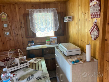 La roulotte ha un letto matrimoniale, uno da una piazza e mezza e un lavandino, mentre spostandosi nella casetta in legno si trova un tavolo, un secchiaio e il fornello con l'attacco per il gas. Fuori un giardinetto con una zona con tavolo in legno e le sedie.