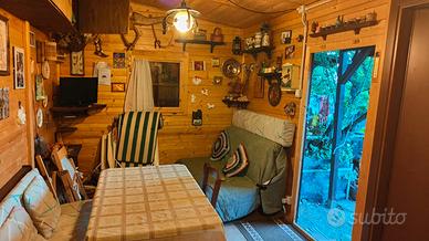 Roulotte con casetta in legno situata presso il campeggio di Sestola (MO). La roulotte ha un letto matrimoniale e uno da una piazza e mezza. Nel preingresso in legno si trova un divano letto per un totale di 6 posti letto.