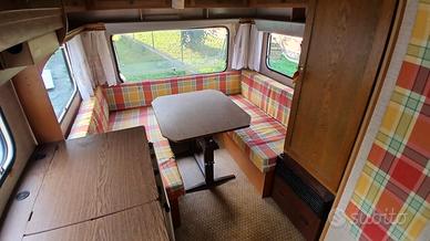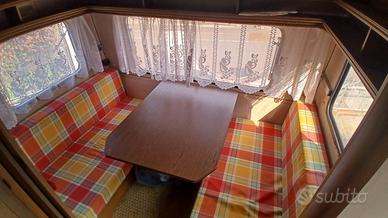 o un grande letto matrimoniale posteriore che si trasforma in tavolo con la seduta che gira intorno al tavolo nella parte posteriore della roulotte, da cui si ottiene un tavolo dove si mangia bene in 4.