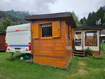 Vendo TUTTO ASSIEME roulotte e preingresso in legno. Hobby kmfe del 2006 ferma da 12 anni, con qualche lavoro da fare e da revisionare. Letto matrimoniale, tre letti a castello, letto matrimoniale in dinette. Moquette x l'inverno e boiler x l'acqua calda. Vendo assieme a preingresso in legno di 7mq, veranda di 12 mq con tende in PVC apribili. Tutto visibile presso il Camping Presanella a Temù (BS)
