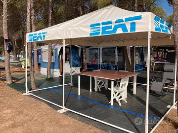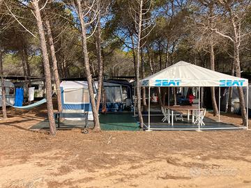 Roulotte spaziosa con ampia veranda , cucina esterna con fornelli a gas e microonde, 2 frigoriferi, grande barbecue, ampio gazebo per colazioni pranzi e cene con vista mare. Il campeggio offre anche pizzeria e ristorante, market, area gioco bambini , servizi igienici e docce.