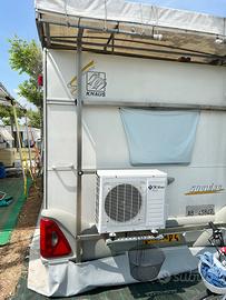 La roulotte è datata e non può essere trainata perché ho messo una copertura in acciaio con telo che ripara dal sole e la struttura porta macchina clima esterna .