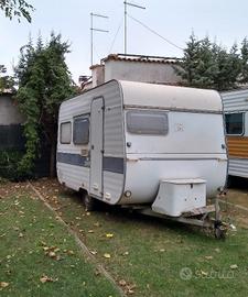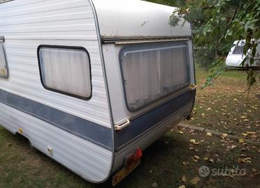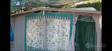 Roulotte, datata ma in buono stato, non marciante, completa di veranda, cucinino, gazebo 6x3 pavimento in mattonelle di plastica per la veranda e per il cucinino, tavolini, sedie...tutto l'essenziale per fare campeggio. Attualmente si trova in un campeggio sul mare a Latina.