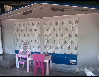 Vendesi roulotte elnagh 550 completamente rimessa a nuovo (rifatta coibentazione, sostituito oblò superiori, fatto parquet, 2 letti nuovo uno matrimoniale che ha anche il contenitore e uno francese, chiedere info per ulteriori foto degli interni), veranda nova in condizioni perfette (noi abbiamo messo in veranda un divano letto matrimoniale, armadio, wc chimico e cassettiera/comodino) il pavimento in veranda e anche nel pre ingresso esterno è stato realizzato con struttura in acciaio rialzato da terra (niente umidità) rivestito in legno e parquet grigio, cucina componibile completa, in condizioni perfette (compresa di frigo e fornelli); pre ingresso dove si trova il salotto da esterno e tavolo da pranzo. Chiusura con teli in pvc bianchi nuovi, telo superiore di copertura in ottime condizioni. Si trova presso il camping Spinnaker a Marina Palmense, possibilità di rimuovere tutto e spostarlo (roulotte con documenti in regola). Se si decidesse di lasciarla in campeggio non necessita di smontaggio a fine stagione! Informazioni aggiuntive in privato
