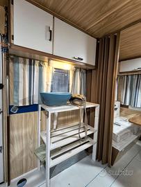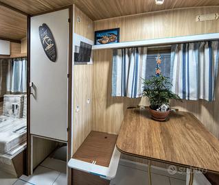 Acquistata un anno e mezzo fa già in ottime condizioni, tenuta maniacalmente, ma ho apportato alcune modifiche per restyling: -tolto stufa a gas -tolto cucina e sostituita con mobile stile shabby con lavabo blu in ceramica -dipinto in stile alcune bordure -vano bagno impermeabilizzato con apposite guarnizioni e verniciature -porta potty (wc mobile) nuovo (mai usato, ancora in confezione originale e sigillata) -impianto corrente separato 220 V e 12 V -lampadari a soffitto nuovi e a led -tende nuove in puro cotone di Chieri fatte su misura -zanzariere a tutti gli oblò -pavimento verniciato a nuovo in stile -panche che diventano letto matrimoniale verniciate anche internamente, con seduta rifatta in legno massello di pino -cuscini nuovi in puro cotone per panche -copricerchi vintage in metallo nuovi -pneumatici nuovi -ruotino a timone nuovo -sostituite 2 griglie di aerazione e ripulite (con smontaggio completo) tutte le altre Tendaggi aggiuntivi che non ho mai usato (neanche montato per prova) Libretto in regola Revisione fino a luglio 2026 3500 euro richiesti