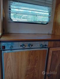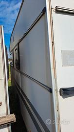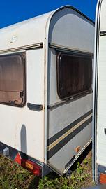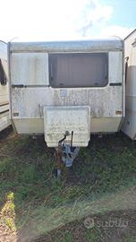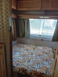 Roulotte posizionata in Area sosta camper a Marina di Grosseto, 4 posti letto, senza bagno, con veranda e tendalino, in buone condizioni; non aggiornata la revisione.