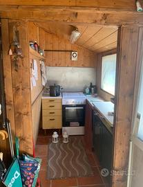 Vendo roulotte fissa con casetta di legno grande, composta da salotto con tavolo in legno massiccio da 8/10 persone, cucina separata con fuochi a gas, stanza con letto a castello, roulotte con 2 letti a una piazza emmezza, ripostiglio dove poter posiz wc chimico, grande zona ripostiglio coperta per attrezzature ( barbecue, sci bici ecc