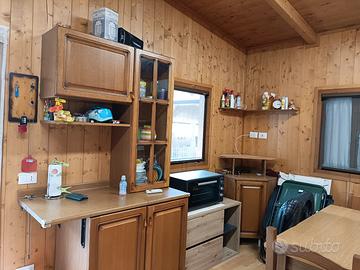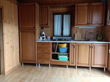 Cucina completa con lavello, scolapiatti, piano cottura 4 fuochi a gas (gpl con bombola esterna), frigorifero e congelatore.