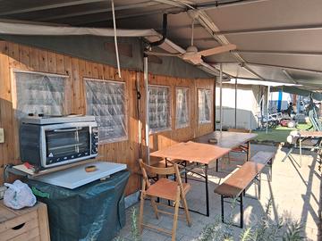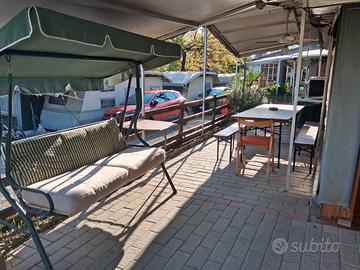 Roulotte stanziale in piazzola piastrellata con autobloccanti , con copertura completa di veranda in Pvc, con gabbiotto in legno munito di cassapanca che diventa un letto di una piazza e mezza,frigorifero cucina e lavandino. La roulotte dispone di un grande letto matrimoniale più un letto singolo, arredamento originale con armadio, bagno con acqua corrente e mobiletti. IL PREZZO E' TRATTABILE
