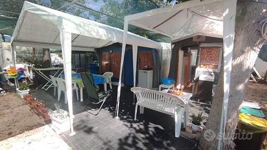Vendo piazzola attrezzata, comprensiva di roulotte (presente libretto di circolazione), veranda, gazebo grande, cucinotto (due stagioni di utilizzo), e gran parte di ciò che è visibile nelle foto (armadiatura, tutti i mobili della cucina, rubinetto e lavandino, tavoli, sedie, teli vari da pacciamatura, telo in pvc, ...).