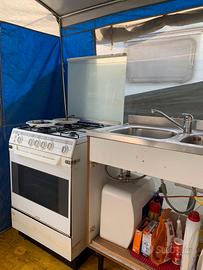 Vendo roulotte stanziale bustner del 92 con 4 posti letto interni, bagnetto senza wc,cucina e frigo mai usati, in veranda (letto castello),mobili in plastica e armadietto 2 ante in legno,attrezzata di tutto: tavolo in legno allungabile più 2 tavoli in plastica e 12 sedie,stuoie per l esterno, struttura in alluminio con telo bianco ignifugo fatti fare su misura nel 2024 con scolo laterale6x5m usata un anno con teli laterali e frangivento, vendo con tutto dentro (armadi, assi per fare pavimento veranda e cucinotto, condizionatore con aria calda/fredda) compreso il cucinotto con i suoi accessori (frigo con congelatore 3 cassetti, mobiletti, fornello a gas,pentole e stoviglie, lavello con boiler), pronta per essere utilizzata per l’anno estivo. No perditempo solo per chi è interessato €3800 trattabile