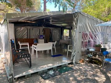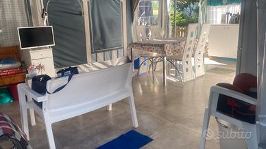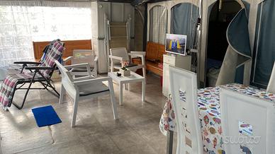 Roulotte Targata 4 posti letto ,veranda con impianto elettrico ,copri veranda con angolo cucina in marmo scaldabagno frigo climatizzatore ,copertura totale in pvc ,4 sedie interne tavolo in veranda ,4 sedie tavolo in giardino esterno ,ulteriori foto verranno allegate in privato,non subentro ,tutto da portare via