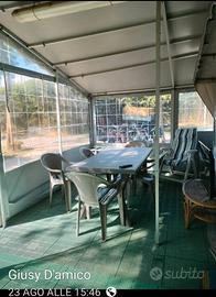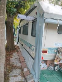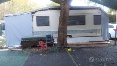 5.690 EURO - VENDO A PREZZO INTERESSANTE Roulotte ADRIA mod. 5206-LH serie Unica di mt. 5.50, immatricolata, dotata di wc chimico, composta da: camera separata da porta scorrevole con 2 letti singoli 80×190 (con materassi ortopedici) separati da un comodino; 1 letto matrimoniale trasformabile in una piazza e mezza oppure in dinette, cucina mai utilizzata, frigorifero e ampia armadiatura. È corredata da veranda ITALTENDE (fatta su misura per la roulotte) con relativo controsoffitto, al cui interno vi sono: 1 letto matrimoniale, 1 frigorifero ed armadiatura varia (molto capiente). Sulla pavimentazione interna di piastrelle in plastica è stato posato il linoleum colore parquet. Il tutto è circondato da una struttura di circa 60 mq. con coperture laterali. All'interno della struttura vi è un cucinotto completo di: frigorifero, cucina a gas e mobiletti vari. Su tutta la piazzola (roulotte compresa) è stata posata pavimentazione di piastrelle in plastica. All'interno della struttura vi sono: 2 tavoli, tavolini vari, 2 carrelli portavivande, sedie, sdraio, mobiletti e scarpiere. Lascio pentole, 1 televisore, 2 biciclette, stoviglie, posate, barbecue, accessori cucina, bacinelle, bidoni rifornimento acqua, etc. La Roulotte è visibile, previo appuntamento, presso un campeggio di Punta Marina (RA). Per informazioni, contattare Giusy al n. 3477918169