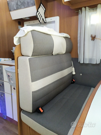 Letto matrimoniale in coda con possibilità di modulazione dell'altezza. Letto matrimoniale basculante elettrico, e possibilità di trasformare la dinette in un ulteriore letto matrimoniale.