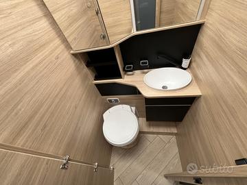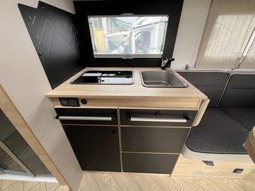 tendalino esterno, pannello solare 140 W, zanzariera per la porta, oscuranti cabina, estensione letto gemello