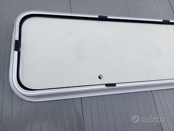 Sportello - portellone - gavone - botola per camper o caravan nuovo mai montato adatto per pareti fino a mm.32 di spessore, struttura in alluminio anodizzato e lamiera bianca in alluminio esterna con costa lato cerniere interno in compensato e PVC grigio chiaro NON completo di serrature e guarnizioni misura esterna totale mm.1525 x 375 misura foro mm.1492 x 345 misura sportello apribile mm.1470 x 320