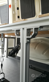 Struttura espandibile che diventa divano per lasciare una corsia libera per carico merce, moto o bici, rialzata per poter mettere sotto scatole, fornelli o altro.