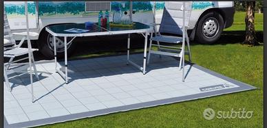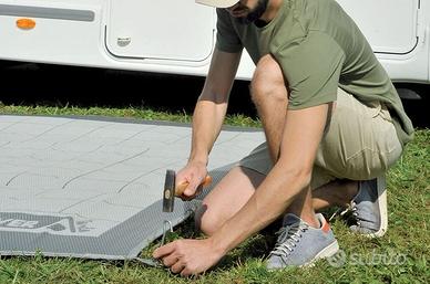 Tappeto da campeggio ideale per l'isolamento al suolo dell'ambiente veranda. In speciale tessuto in polipropilene a trama fitta impedisce il passaggio di insetti e impurit dal suolo, senza per danneggiare l'eventuale manto erboso con cui a contatto. Stabile al suolo grazie ai 4 punti di ancoraggio angolari. Leggero, versatile e traspirante asciuga velocemente in caso di umidit impedendo la formazione di muffa. Velocissimo da pulire con un semplice getto d'acqua. Con stampa double face pu essere posato su entrambi i lati. La resistenza ai raggi UV mantiene inalterati nel tempo i colori e le caratteristiche tecniche. Pratico e poco ingombrante si ripiega facilmente. Custodia per il trasporto inclusa.