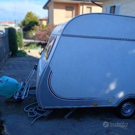 Caravan Sub Roller Mod. Jazz 39DD immatricolazione novembre 2006 Lunghezza 5,476 m Larghezza 2,232 m Massa a vuoto kg 860 Massa a pieno Carico kg 900 Revisione valida sino al 2028 Tassa di circolazione pagata per l’anno 2026 Tetto – pareti frontale e posteriore in vetroresina antigrandine Sottoscocca con protezione appena rinnovata 3° proprietario Telaio AL-KO Gancio antisbandamento AL-KO AKS Pneumatici in ottime condizioni, mescola morbida e battistrada con pochi km percorsi Ruota di scorta Porta biciclette FIAMMA Carri Bike su timone VERANDA Fanaleria posteriore aggiornata con versione dotata di luci retronebbia e retromarcia Frigorifero trivalente con cella freezer separata Piano cottura a due fuochi con copertura in vetro Pompa impianto idrico nuova WC Thetford a cassetta estraibile Bagno in termoformato con mobiletto sottolavello e pensile Pensile sopra dinet posteriore trasformabile in letto 5 Finestre tutte apribili oblò fiamma trasparente corridoio centrale Porta a scuderia Portabombole con accesso facilitato Ampio gavone frontale con apertura servoassistita Vendita tra provati – pagamento in contanti