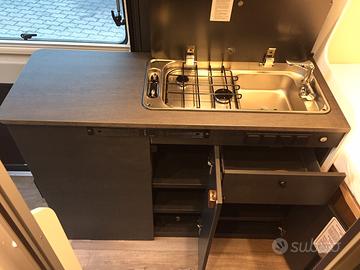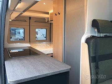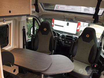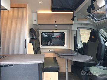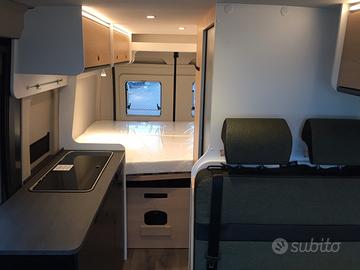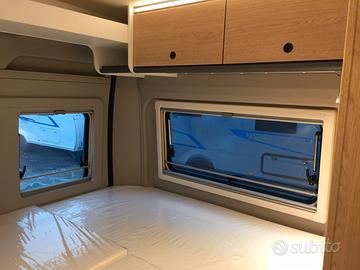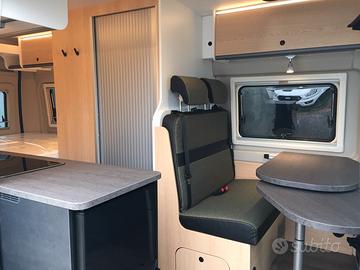 Van così composto: dinette anteriore, blocco cucina e locale toilette centralmente, grande letto matrimoniale posteriore e tetto a soffietto con due posti letto. Tra le caratteristiche troviamo l'ampio oblò sopra la cabina che, non solo lascia entrare molta luce, ma dona una piacevole sensazione di spazio e una maggiore altezza nella zona giorno. La cucina sfrutta un frigorifero a compressore nella parte anteriore così da ottenere un grande piano di lavoro. La toilette è dotata del sistema girevole vario per poter creare rapidamente il box doccia.