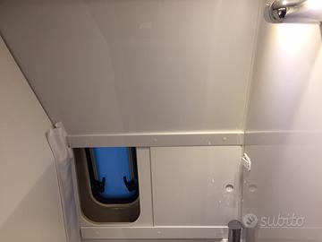 Accessori extra: colore Grigio Lanzarote, tetto a soffietto, ruota di scorta con staffa e martinetto, serbatoio diesel da 90 litri, pedana doccia in legno, oscuranti cabina plissettati, riscaldamento Truma Combi Diesel, predisposizione cavi retrocamera, pedana doccia in legno.