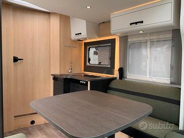 Semi integrale con dinette face to face. Al centro la pratica cucina ed il frigorifero con cella freezer separata, il vano toilette con doccia contrapposta e porte di separazione. Nel posteriore due grandi letti gemelli trasformabili in matrimoniale con sottostante grande garage.