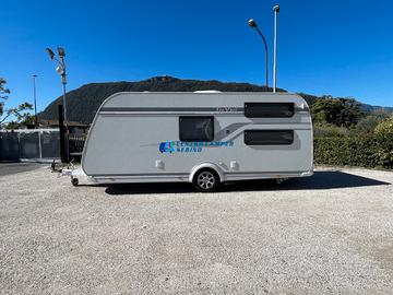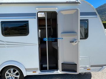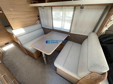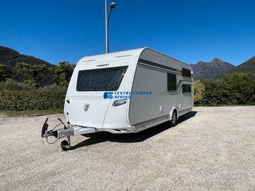 TABBERT DA VINCI 500 KD, caravan 6 posti con 4 posti letto sempre pronti (letto matrimoniale e letti a castello singoli laterali), comoda dinette trasformabile in letto aggiuntivo, tenda di separazione camera / zona giorno, due armadi capienti, bagno con doccia separata.