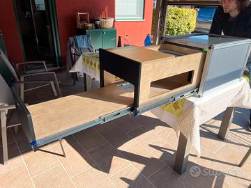 Materiali: Compensato Marino Di Betulla scandinavo da 15 mm Per Struttura Interna - Telaio Profilo In Alluminio e Pannelli Dibond Per Scatola Esterna, cursori bloccabili con un carico massimo di 120 kg, tavolette pieghevole, rubinetto pieghevole, pompa dell'acqua con cablaggio elettrico da 12v,