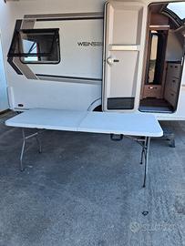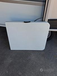Tavolo in resina pieghevole misure aperto 180X74 Quando chiuso le sue gambe si piegano all'interno e le misure sono 90X74 Con maniglia per trasporto. Utilizzato in campeggio vendo per inutilizzo