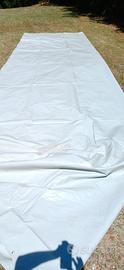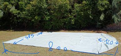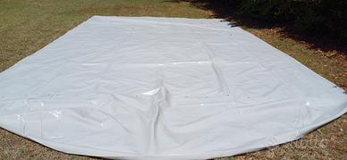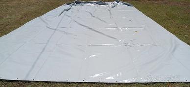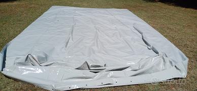 Telo sagomato frontalmente adatto a camper roulotte nonché furgoni auto barche ecc. Il materiale è resistente in PVC pesante color grigio con occhiellatura in tutto il perimetro a passo 25cm. completo di 1 confezione di elastici . Telone integro e in ottimo stato Larg.485 Lung.800+120 .spedizione disponibile in tutta Italia al costo di 30euro.